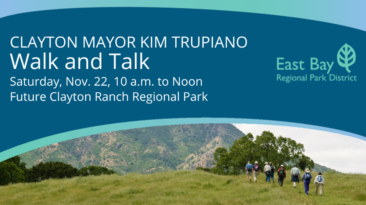 Reminder: Obtaining paper permits from the old iron rangers will be discontinued after December 14. From then on, permits can be purchased online or use credit card/tap-to-pay at the ranger kiosk located at the main entrance. | | Wildcat Creek Restoration Completed in Regional Parks Botanic Garden | An erosion repair project has been completed along Wildcat Creek in the Botanic Garden's canyon section. The undercut bank was restored and the channel was stabilized with logs to redirect water flow away from the bank. Wrapped soil layers planted with willows will further help to stabilize the bank. Stroll along the path in the canyon section next to Wildcat Creek to see the newly repaired area. | | Clayton Ranch Walk and Talk: Nov. 22 | | Join Park District Board President John Mercurio and Clayton Mayor Kim Trupiano on a Walk and Talk at the future Clayton Ranch Regional Park on Saturday, Nov. 22, from 10 a.m. to noon. Explore a future Regional Park, engage with local representatives, and learn about the physical and mental health benefits of the outdoors.